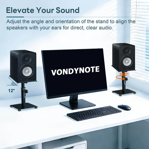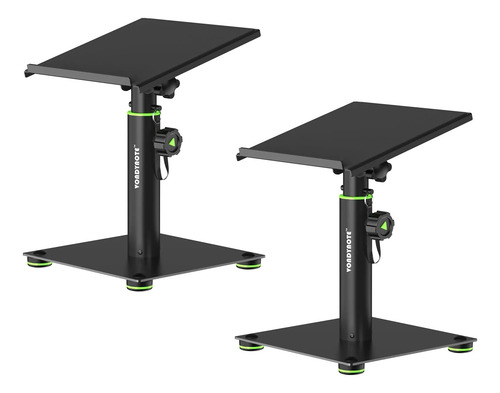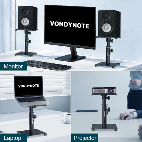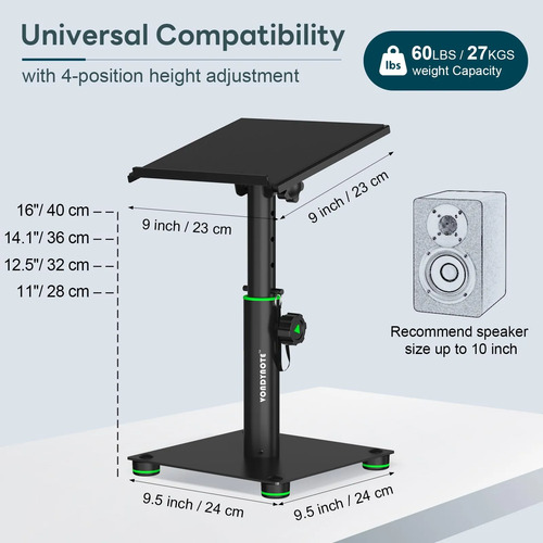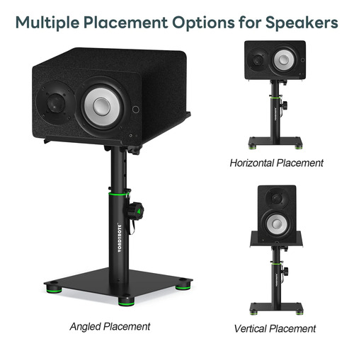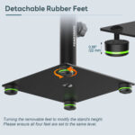 Placa superior de 9 x 9 pulgadas con una almohadilla EVA de 2 mm de cobertura completa, reduciendo la resonancia y mantiene los altavoces firmemente agarrados. La altura se fija con un perilla y se asegura ademÔs por un pasador de bloqueo para un posicionamiento sólido. Los pies de goma antideslizantes evitan que se muevan y proporcionan estabilidad.