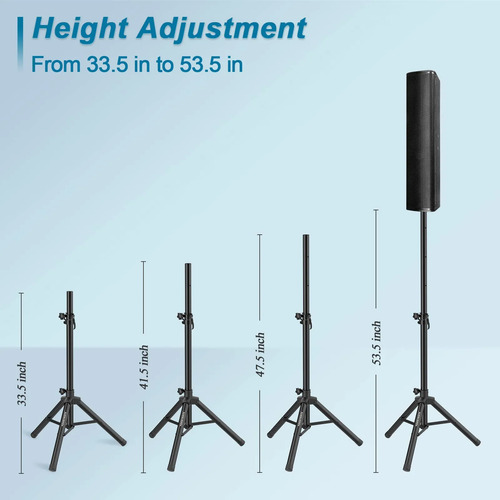 Altura ajustable: el pasador de soporte de seguridad garantiza que tu altavoz sea seguro y estabilidad. Cuatro agujeros de perforación se colocan en el tubo de soporte para cumplir con diferentes requisitos de altura. El rango de altura es de 33.5-53.5 pulgadas, cuatro alturas ajustables son de 33.5 pulgadas, 41.5 pulgadas, 47.5 pulgadas y 53.5 pulgadas.