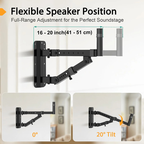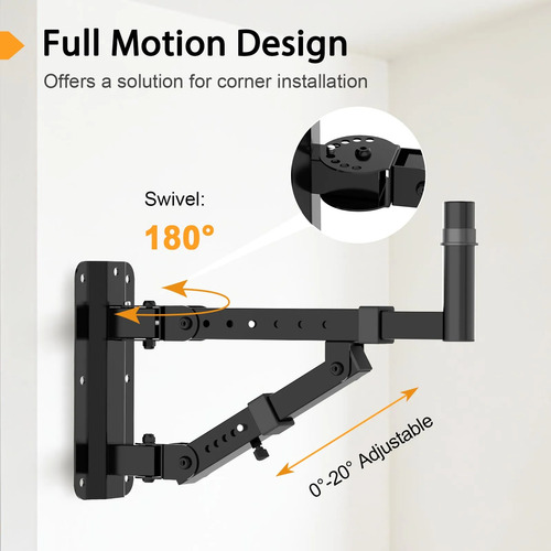 Diseño de movimiento completo: el soporte permite un giro de 180o y soporta ajuste de inclinación horizontal o de hasta 20o, lo que permite un posicionamiento ideal del campo de sonido para tus altavoces. También es una solución ideal para la instalación de esquinas.