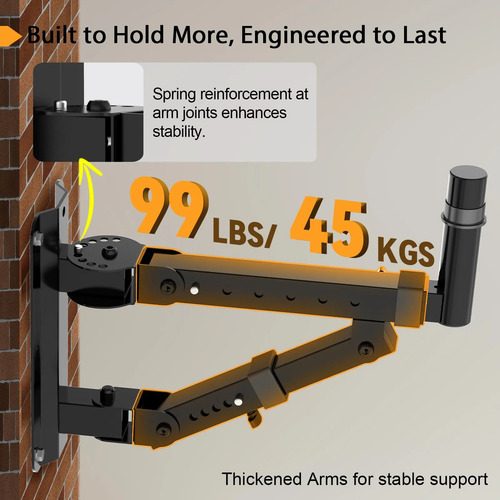 Estable y resistente: construido con acero resistente y acabado con un revestimiento negro. Se añade un refuerzo de resorte en las articulaciones del brazo para una mayor estabilidad, sin afectar por fuerzas externas. Cada soporte soporta hasta 45 kg.