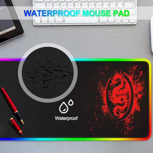 15 modos de luz RGB y tamaño grande: El tapete de mouse RGB para juegos cuenta con 15 modos de iluminación: incluye 9 tipos de luz monocromática, 1 tipo de alternancia RGB, 2 tipos de respiración RGB, 3 tipos de funcionamiento RGB. La luz es brillante pero no impide ver el monitor. El tamaño de 80 x 30 cm se ajusta perfectamente a tu mouse y teclado y todavía tiene una gran cantidad de espacio de movimiento.