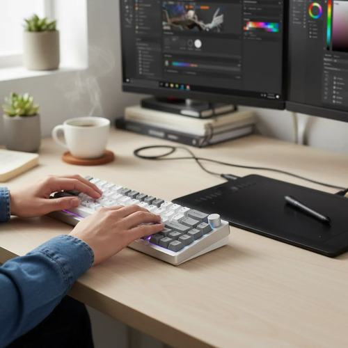 Teclado personalizado QMK/VIA: desbloquee infinitas posibilidades de personalización con el soporte completo QMK/VIA del YUNZII AL68. Este teclado programable permite a los usuarios reasignar teclas, crear macros y personalizar la retroiluminación con facilidad. Compatible con Mac, Windows y Linux, este teclado mecánico inalámbrico personalizado Qmk/ vía es ideal para juegos y trabajo profesional. Tome el control de la distribución de su teclado y disfrute de lo último en funcionalidad definida por el usuario.