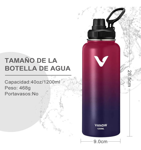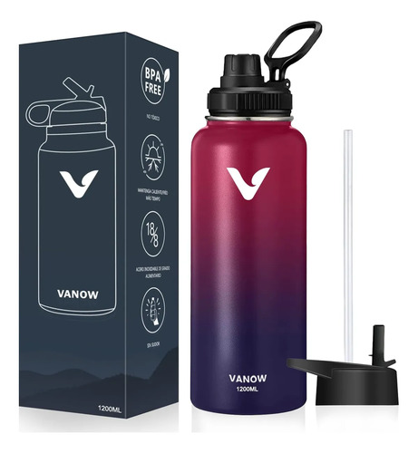 Aislamiento al vacíoEl termo VANOW mantiene las bebidas heladas durante 24 horas y calientes hasta 12 horas con doble pared y aislamiento al vacío. Esta botella de agua de acero inoxidable sin BPA no transfiere sabores, no suda y no se oxida.