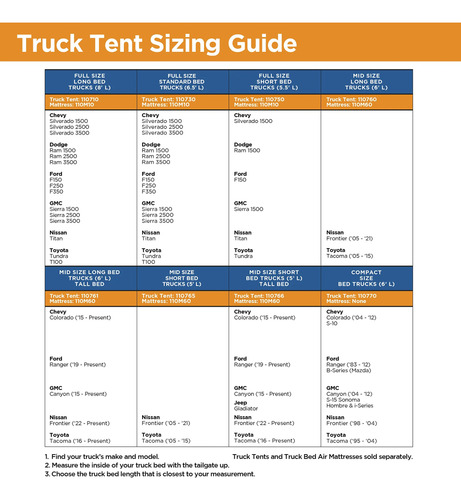 Fácil de instalar: la tienda de campaña incluye postes codificados por colores y bolsillos para postes para una instalación rápida y fácil, lluvia y bolsa de cosas con guía de configuración cosida. Tamaño para tu camión: consulta nuestra guía de aplicación (guía de tallas) en las guías y documentos del producto