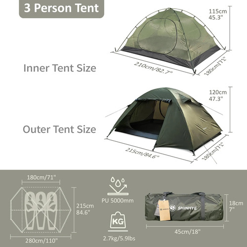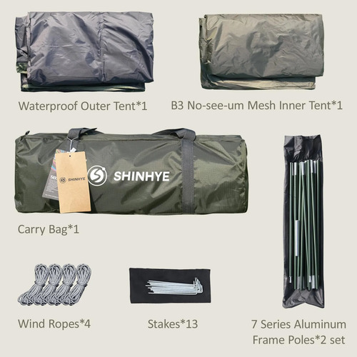 Profesional impermeable y resistente al vientoLos materiales de la tienda de campaña ShinHye están hechos de materiales de alta calidad, fibra de poliéster 210T tela Oxford 210D malla B3 sin transparencia, mano de obra fina, ofrece una excelente protección UV. Adopta la tecnología impermeable ShinHye a costuras selladas de doble costura, bragueta de lluvia de poliéster y lámina de piso con revestimiento de poliuretano 5000. Esta tienda de campaña está totalmente probada en el campo para soportar fuertes lluvias, asegurando que permanezcas protegido de los elementos durante tus viajes de campamento