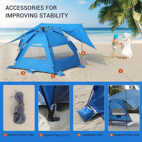Elegear Tienda para Playa con UPF 50+ Refugio Solar de Playa Ligero, Instantáneo Portátil Carpa para Playa Camping, Tienda Sombra con Cremallera Extendida para Camping de Playa, Azul