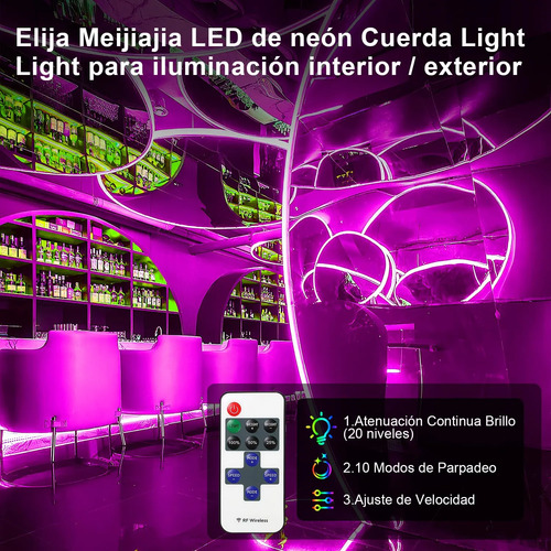 Control Remoto por Infrarrojos Regulable : A diferencia de otras tiras de luz de neón tradicionales, las tiras de luz de neón RUBOQE están equipadas con un control remoto IR, puedes ajustar de forma remota el brillo, el modo de parpadeo y la velocidad de parpadeo de la tira de luz a través del control remoto, creando fácilmente la experiencia de iluminación y el ambiente de fiesta que deseas.