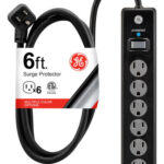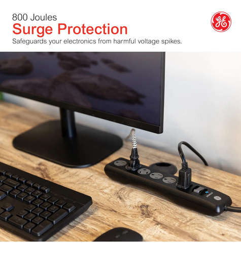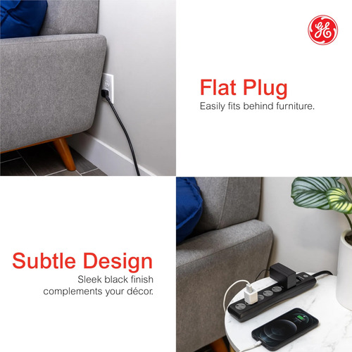 GE Tira Multicontactos De 6 Salidas con Supresor De Picos Y Enchufe Plano, Protector de Sobretensión, Cable De Extensión De 1.8 Metros (6 Pies), 800 Julios, Negro, 1 Unidad, 33661