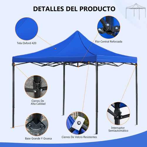 Protección Total: Esta carpa para exteriores está fabricada con lona Oxford de alta densidad, que ofrece una excelente protección solar y es 100% impermeable. Bloquea hasta el 99.99% de los rayos UV, protegiendo eficazmente contra la lluvia y la intensa radiación solar. Los cierres de velcro reforzados garantizan una conexión firme entre el toldo, las paredes laterales y la estructura, evitando que el viento lo sacuda y mejorando la estabilidad general. Resistente y duradero, soporta condiciones climáticas adversas y un uso frecuente, siendo la elección ideal para eventos y actividades comerciales.