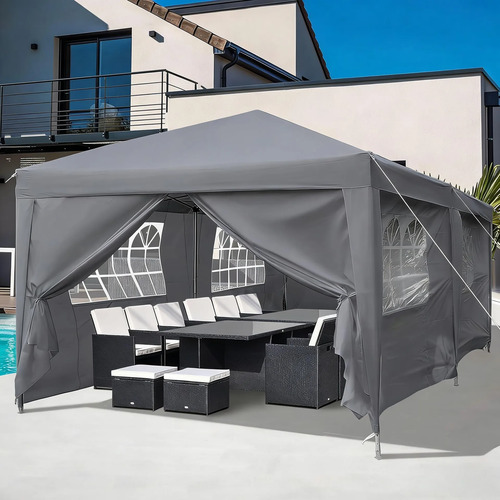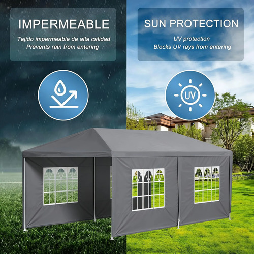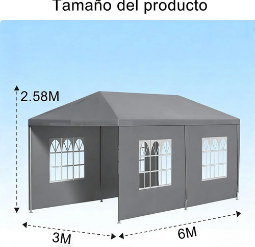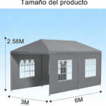 3×6 Carpa Con ParedesEste toldo de 3×3 metros ofrece mucho espacio y es perfecto para todas las actividades al aire libre.Puedes instalarlo en tu jardín para comidas compartidas o colocarlo como toldo sobre tu piscina para disfrutar nadando sin el resplandor del sol.