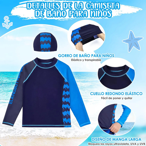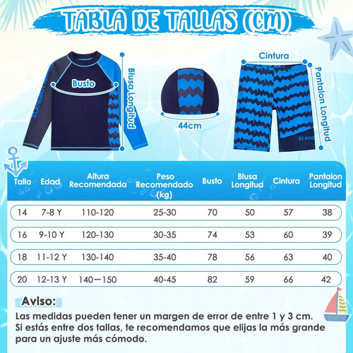Recibirás 1 camiseta de baño de manga larga 1 pantalón corto de baño 1 gorro de natación, proporcionando a tus hijos una cobertura adecuada y una comodidad superior. Nota: Por favor, revisa cuidadosamente la tabla de tallas antes de realizar el pedido.