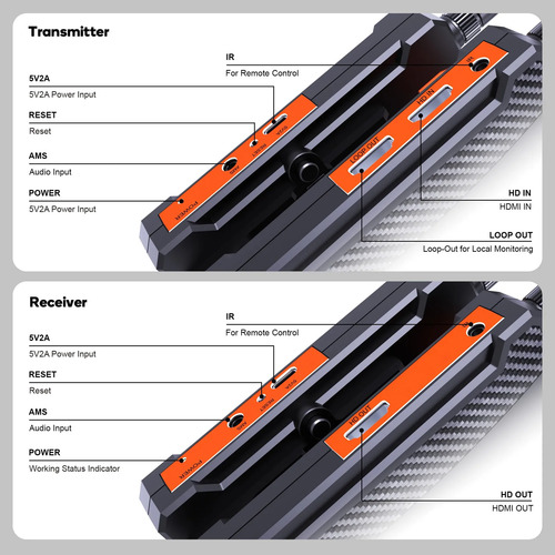 Loop-Out y control remoto IREl emisor y receptor HDMI inalámbrico no requiere instalación del sistema, permite que el dispositivo fuente reconozca comandos remotos simplemente apunte el control remoto al emisor IR conectado al dispositivo fuente para controlar, hay una salida HDMI adicional en el extremo del transmisor, lo que te permite añadir una visualización local para monitorear