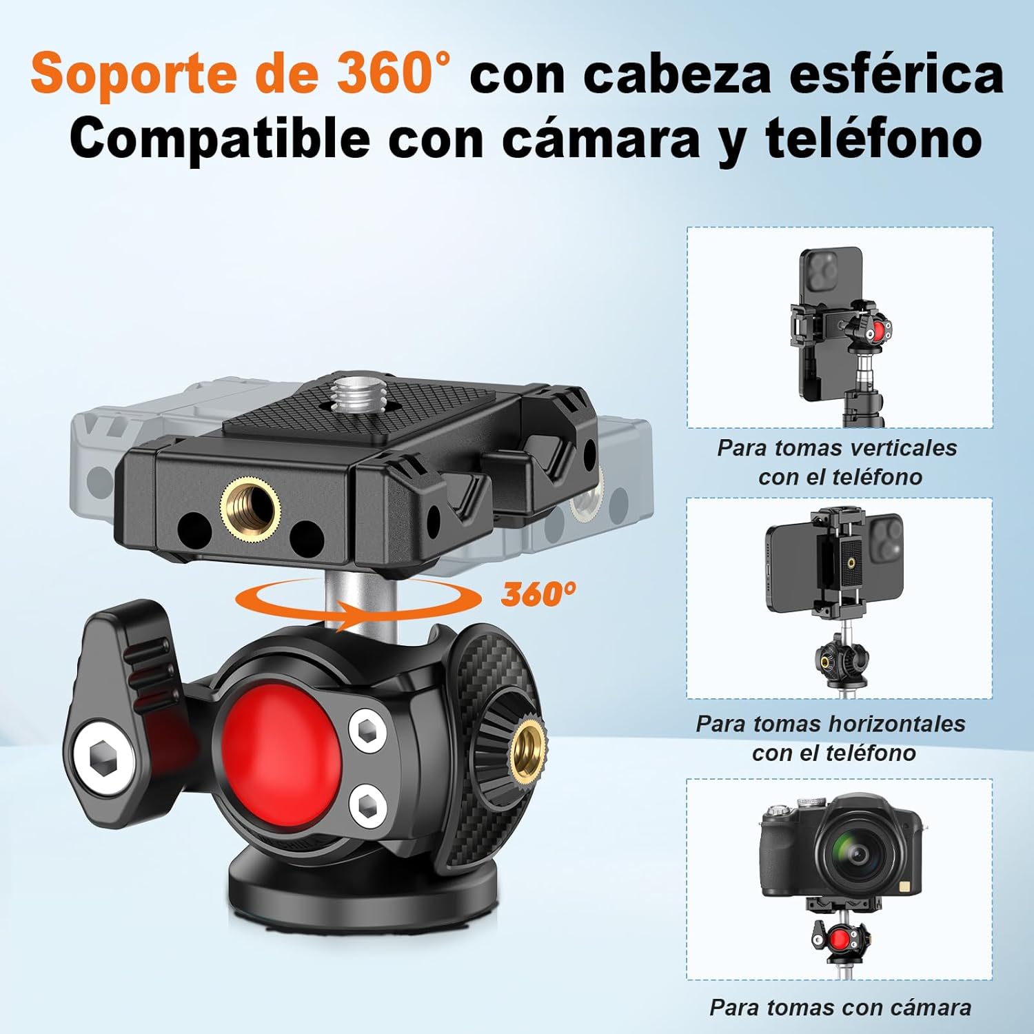 -360 ° Soporte de rotación con cabeza de pelota: La cabeza de la pelota puede girar 360 ° en los planos horizontales y verticales, lo que le permite disfrutar de la diversión de tomar fotos en cualquier ángulo. Además, el lado y el frente del clip del teléfono tienen una tuerca de 1/4 «, lo que puede hacer que el teléfono cambie entre disparos verticales y horizontales libremente.