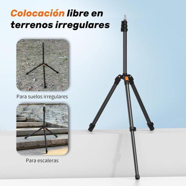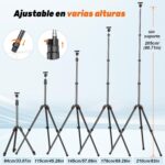 -Ajuste de altura flexible:Tipod Piern y Tube, ambos tienen cerraduras de flip que pueden ajustar su altura deseada rápidamente, diseñe para una varilla telescópica de aleación de aluminio de 6 secciones, la altura con soporte se extiende hasta 210cm sin esfuerzo. (Sin altura del soporte: 205cm)