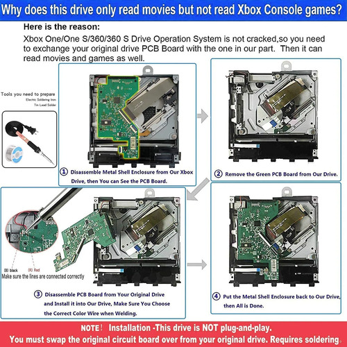 Instalación: esta unidad no es plug and play. Debe cambiar la placa de circuito original de su unidad original. Requiere soldadura.Necesita una cierta cantidad de habilidad práctica. O tu consola se dañará o defectuosa.