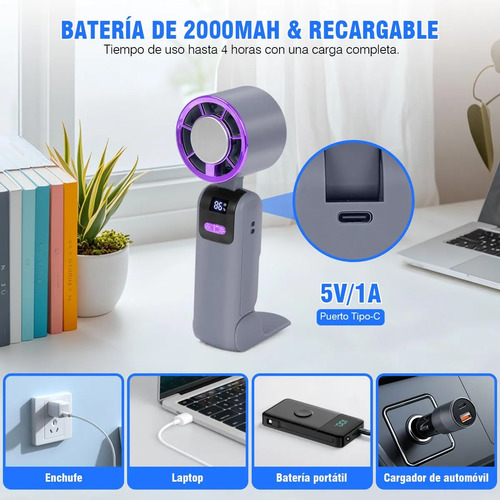 Batería 2000mAh y Carga RápidaEl ventilador personal portátil está incorporada una batería recargable de 2000mAh que se puede utilizar durante 3-12 horas, soporta carga rápida Tipo-C y protección contra sobrecarga, que seguro y eficiente de usar. Este ventilador cabe fácilmente en tu bolsillo o mochila. Puedes usarlo en la mano, colgarlo del cuello con un cordón o colocarlo en su escritorio ideal para viajes