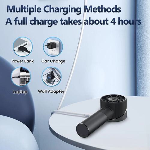 Verious Charging OptionsCarga del ventilador de mano portátil a través de USB con el adaptador de 5V1A incluido, que requiere sólo 8 horas para una carga completa. Puede disfrutar de hasta 3 a 16 horas de enfriamiento después de la carga. El paquete incluye un cable tipo C para una carga conveniente a través de la computadora portátil, la energía móvil o el cargador del automóvil.