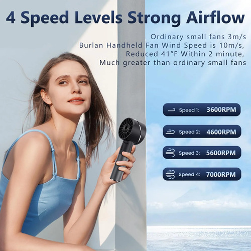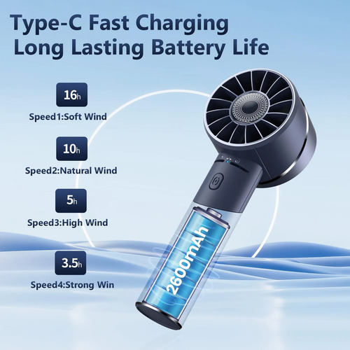 Verious Adjustable Wind SpeedsEl mini ventilador portátil de mano con ajustes de 4 velocidades de viento, disfruta de hasta 16 horas de tiempo de enfriamiento (a la velocidad mínima del viento) con una sola carga, asegurando la comodidad ya sea en interiores o al aire libre durante el verano. Puede controlar el volumen del viento de este ventilador portátil de mano de la naturaleza, lento, medio y rápido de acuerdo a diferentes necesidades. Puede pulsar el botón de encendido para disfrutar de una brisa de velocidad natural.