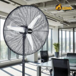 Ventilador metƔlico con base reforzada: Este ventilador metƔlico cuenta con base circular robusta para mayor estabilidad y malla de seguridad, siendo uno de los abanicos mƔs seguros y confiables para ambientes industriales.