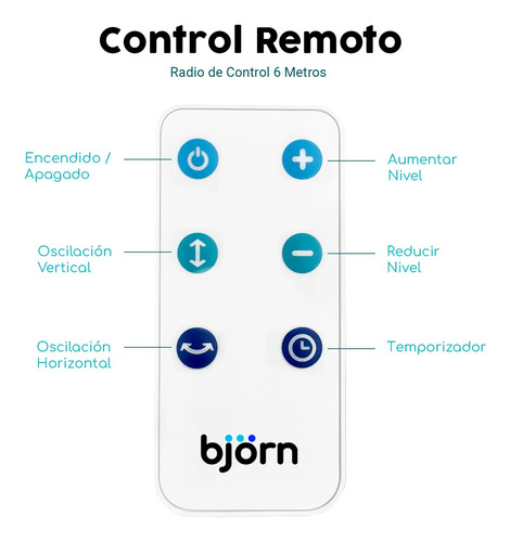 CONTROL REMOTO: Todo la potencia e innovación en tus manos. Utiliza el control remoto para aumentar o reducir el nivel del viento, girar horizontalmente, utilizar el botón 360o, asignar el tiempo de uso de hasta 8 horas y el botón de encendido.