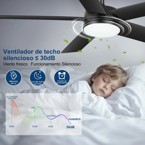 Ventilador de techo silencioso con motor DC reversible. En verano, el ventilador bajará el flujo de aire para traer viento fresco, mientras que en invierno, subirá el flujo de aire para ayudar a equilibrar la calefacción interior. Con la función reversible, puede ofrecerle comodidad durante todo el año. El nivel de ruido es inferior a 30 decibelios cuando el ventilador funciona, para ofrecerle una experiencia de viento perfecta.