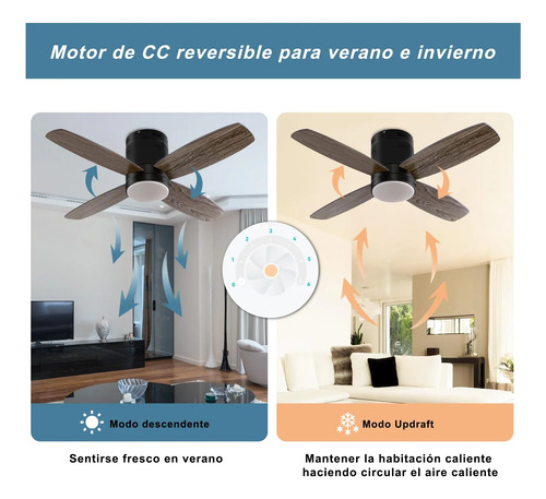 . El ventilador de techo de perfil bajo Ohniyou con luces puede cbiar la dirección del viento de la luz del ventilador de techo desde el flujo de aire hacia abajo en verano al flujo de aire hacia arriba en invierno, haciendo que el ventilador de techo de habitación pequeña pueda proporcionar el viento natural fresco en verano mientras promueve la circulación de aire en invierno.