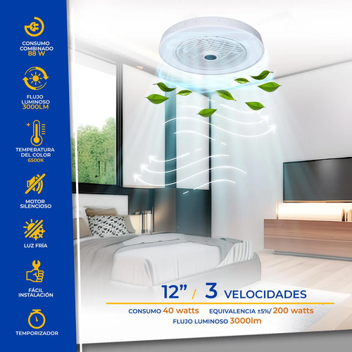 Control remoto y App: Con el mando a distancia de este ventilador de techo con luz led puedes ajustar la iluminación, la intensidad de aire y función de temporización Nuestra lampara ventilador de techo puede ser controlada desde tu celular ya que cuenta con APP compatible con Android y IOS