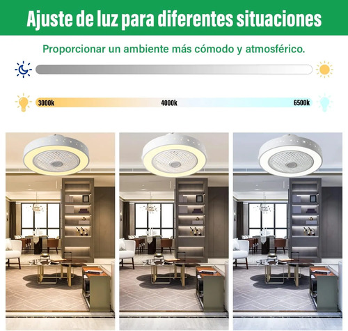 Modos de luz: Este ventilador de techo con control remoto puede cambiar el tono de su iluminación, ajustando la temperatura de color desde luz blanca fría (6000 K), a neutra (4000 K) y hasta cálida amarilla (3000 K) Nuestro abanico de techo con luz led puede regular la intensidad de iluminación desde tenue hasta intensa.