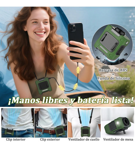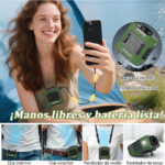 Trabajo continuo por 24 horas Este ventilador portátil para exteriores está equipado con una batería de 10000 mAh, que permite hasta 26 horas de refrigeración continua. Ya sea que estés trabajando o disfrutando de actividades al aire libre, puedes mantenerte fresco durante todo el día sin preocuparte por que la batería se agote. El diseño manos libres facilita su uso en exteriores y también puede funcionar como fuente de carga de emergencia para tu teléfono cuando estás fuera de casa.