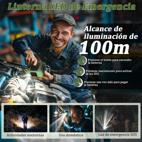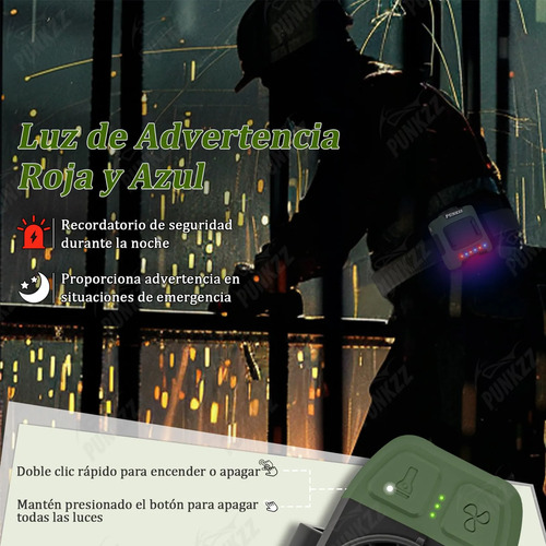 Iluminación LED y luces de advertencia rojo-azul Cuando estés en un lugar oscuro al aire libre, puedes encender la luz LED del ventilador de cintura para iluminarte: 1. Haz clic en el botón de la bombilla para encender la linterna LED 2. Haz clic nuevamente para activar la luz SOS 3. Haz clic una vez más para apagar la linterna. En caso de emergencia, puedes hacer doble clic para encender o apagar las luces de advertencia rojo-azul. Una vez que la situación de peligro haya pasado, puedes mantener presionado el botón para apagar todas las luces.